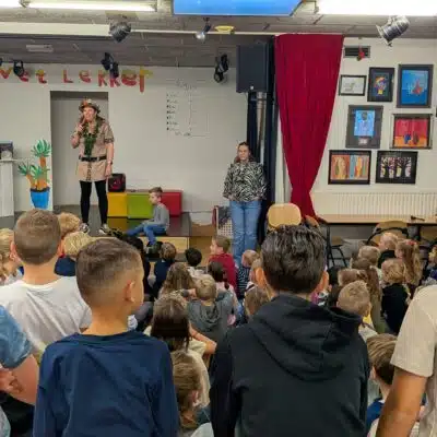 Vandaag zijn we op een bijzondere manier gestart met de Kinderboekenweek. De juffen hadden zich door de hele school verstopt. De kinderen gingen samen met hun maatje op avontuur. Zodra ze iemand gevonden hadden, mochten ze lekker gaan zitten en luisteren naar een spannend verhaal. In drie rondes ontdekten de kinderen zo verschillende boeken en verhalen. Terug in de klassen werd enthousiast verteld welke avonturen ze allemaal hadden gehoord. Een feestelijke en inspirerende start van de Kinderboekenweek!